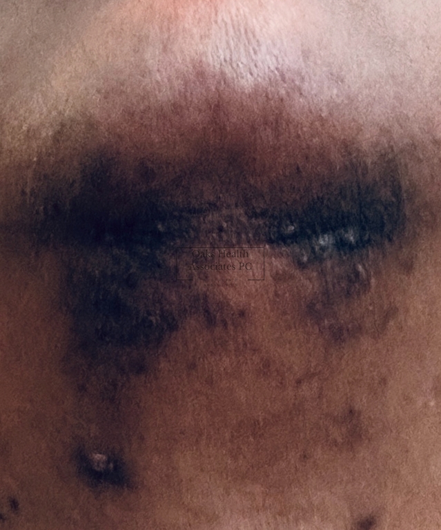 This is a 46-year-old female presenting with severe hyperpigmentation of the chin and neck associated with hirsutism due to PCOS. After 12 weeks of consistent use of SkinMedica's Even & Correct cream, she demonstrated a marked improvement in skin appearance.
